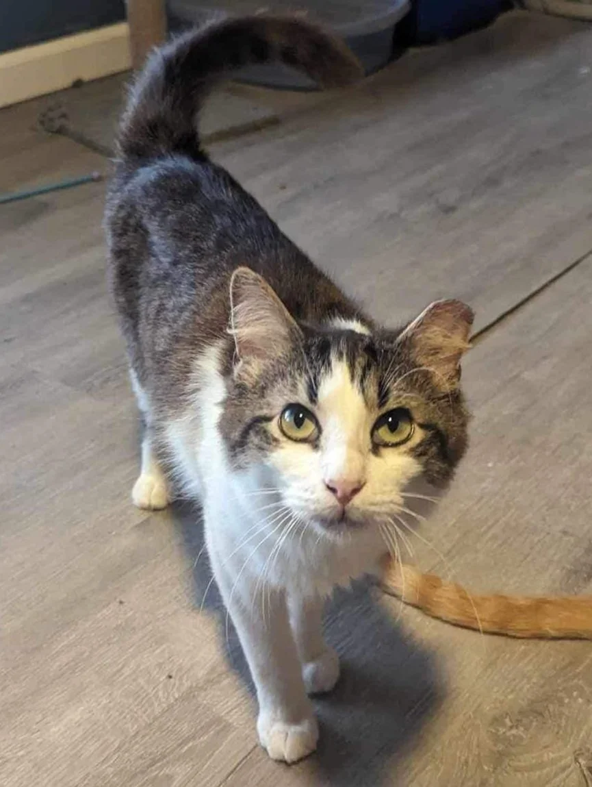 Jackson was found in a tote with 21 other cats in the rain on Christmas Eve night. He is about 8 months old and is very confident him and the boy who demands the most attention. He’s very playful and loves kids! He has 2 kinks in his tail likely from previous breaks, but they don’t hurt him and don’t slow him down. He would love a playmate to play with! He is neutered and fully vaccinated and is looking for his forever home!